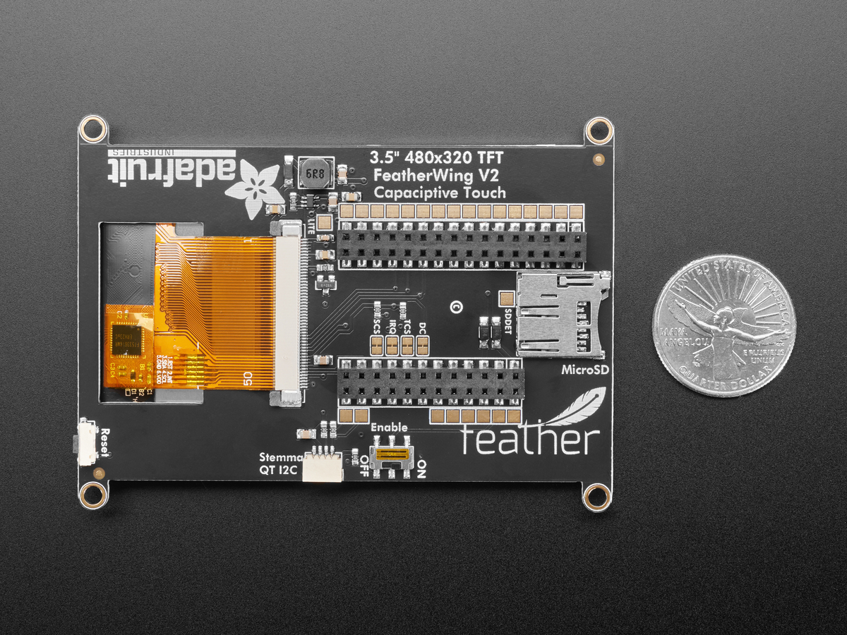 Bedeck your Feather project with a beautiful Adafruit TFT FeatherWing, 3.5" 480x320 Capacitive Touchscreen. This TFT display is 3.5" diagonal with a bright white-LED backlight and a built-in microSD card socket. You get a massive 480x320 pixels with individual 16-bit color pixel control. It has way more resolution than a black and white 128x64 display, and twice as much as our 2.4" TFT FeatherWing. As a bonus, this display comes with a multi-touch capacitive touchscreen attached to it already, so you can detect up to 5 finger presses anywhere on the screen