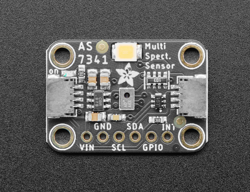 INSERT PRODUCT COPY HERE The AS7341 by AMS is a 11/10 channel spectrometer which is a special type of light sensor that is able to detect not only the amount of light present, but also the amounts of light within different wavelengths. This means that you can use it to detect, much better than the human eye is capable of, what color or colors of light is present. The AS7341 packs within its 3x2mm footprint 16 different sensors that can detect 8 separate, overlapping bands of colored light. As if that weren't enough, it also includes sensors for white light as well as Near Infra-red light, and even sensors made specifically for detecting light flicker at specific frequencies from things like indoor lighting.