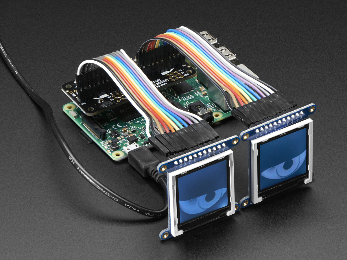 The Snake Eyes Bonnet is a Raspberry Pi accessory for driving two 128x128 pixel OLED or TFT LCD displays, and also provides four analog inputs for sensors. It's perfect for making cosplay masks, props, spooky sculptures for halloween, animatronics, robots...anything where you want to add a pair of animated eyes!