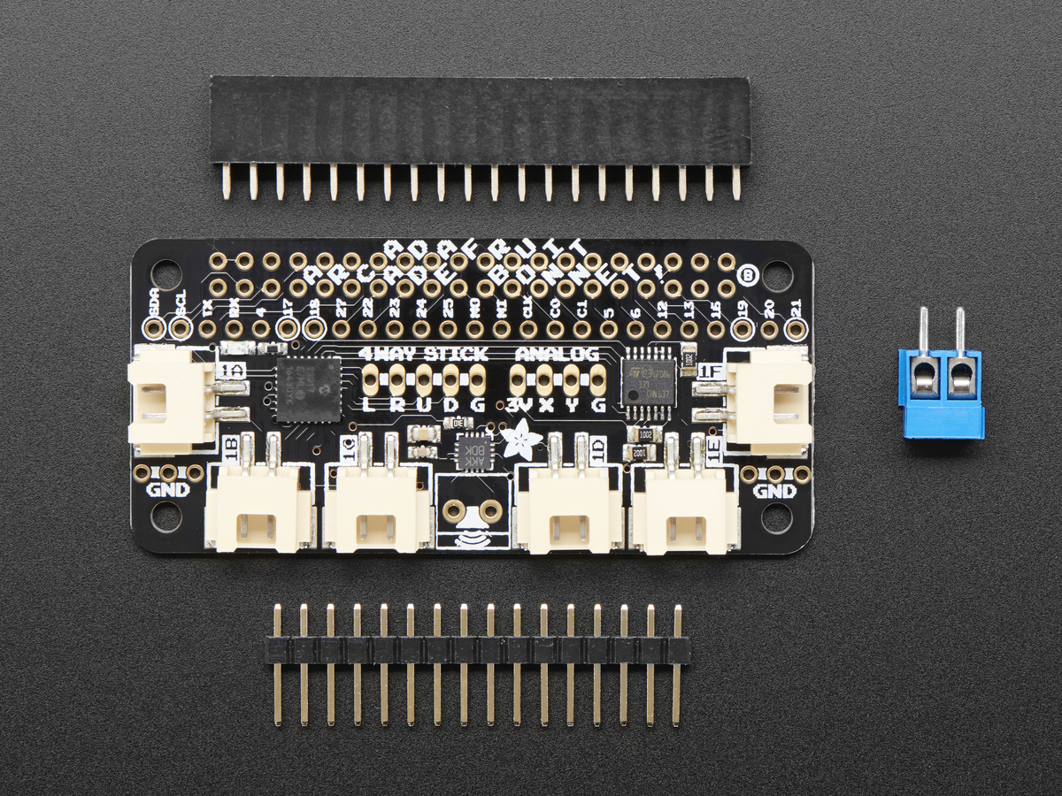 - The JST connectors on the Bonnet mate perfectly with Arcade Button Quick-Connect Wire Pairs.