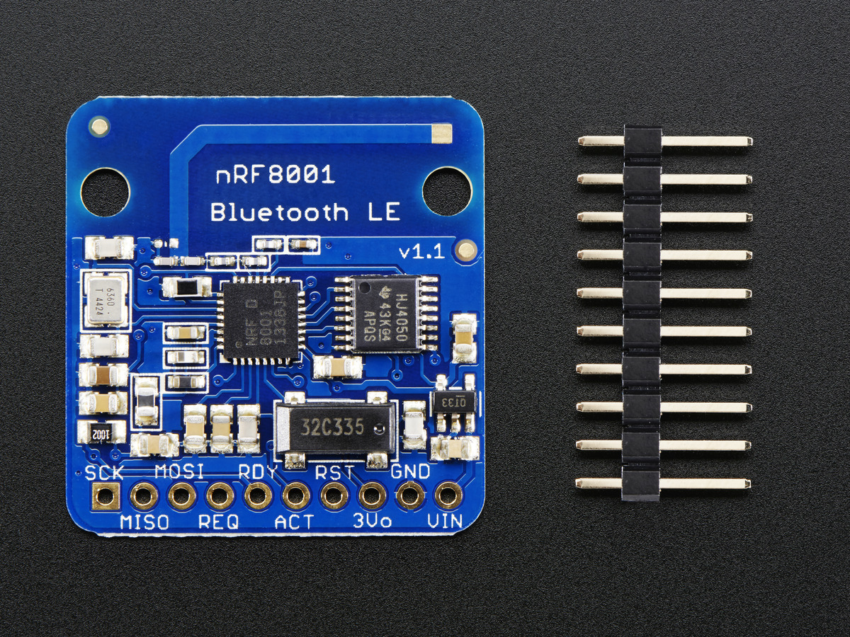 Our Adafruit Bluefruit LE (Bluetooth Smart, Bluetooth Low Energy, Bluetooth 4.0) nRF8001 Breakout allows you to establish an easy to use wireless link between your Arduino and any compatible iOS or Android (4.3+) device. It works by simulating a UART device beneath the surface, sending ASCII data back and forth between the devices, letting you decide what data to send and what to do with it on either end of the connection.