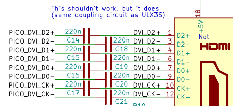 The Rev A board uses a slightly cursed coupling circuit I first saw (and used) on the ULX3S FPGA board, which just connects 3V3 IOs straight into the HDMI socket through some coupling caps.